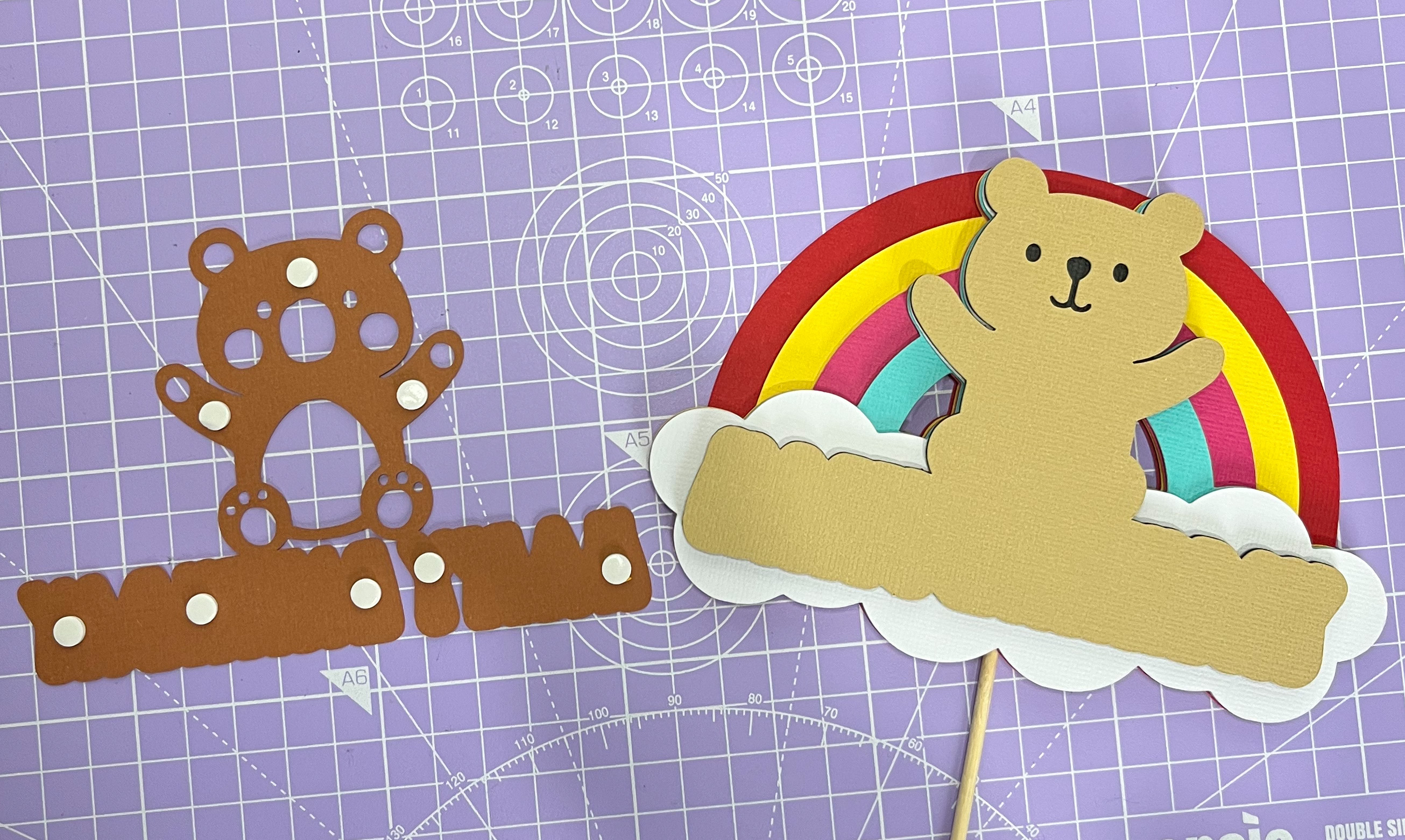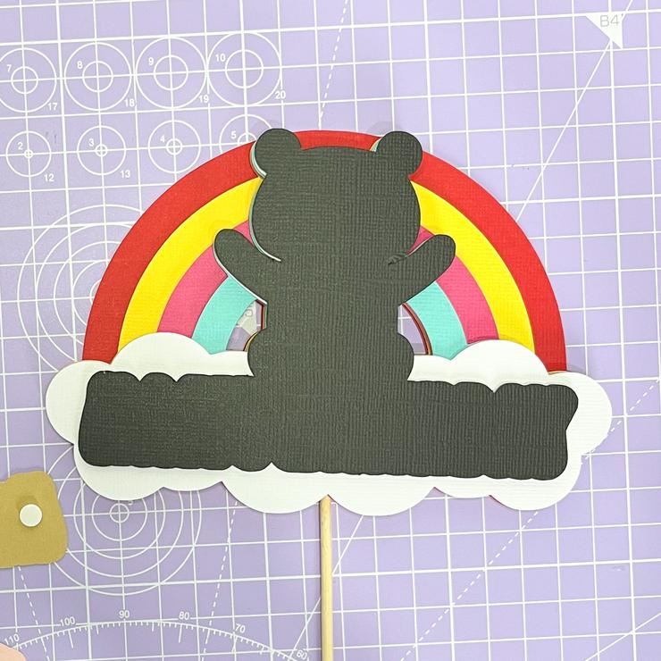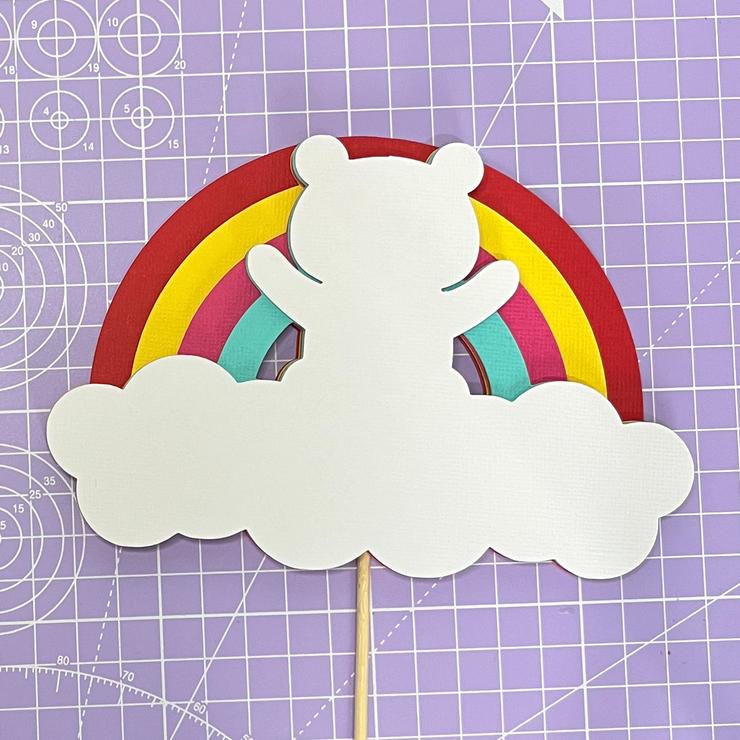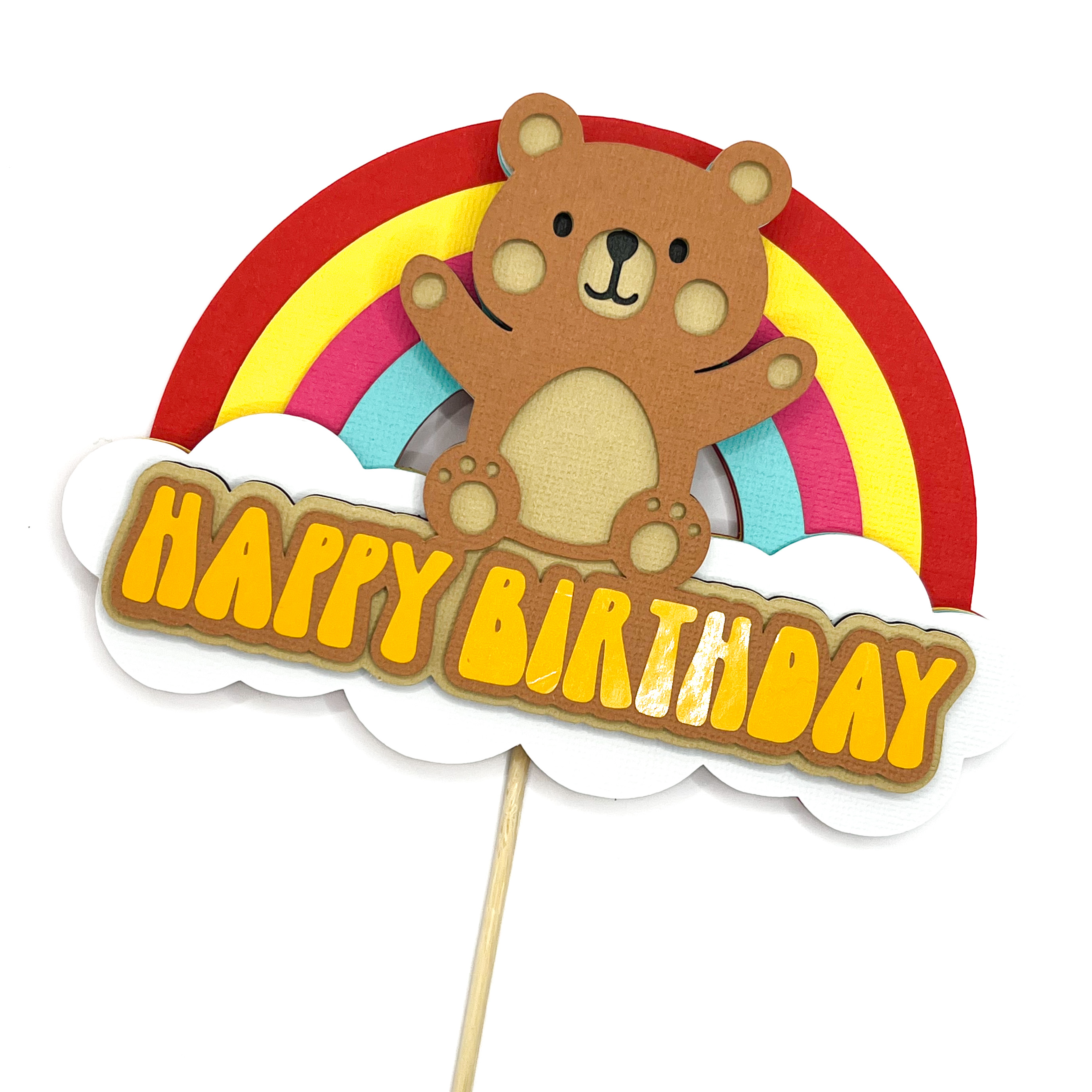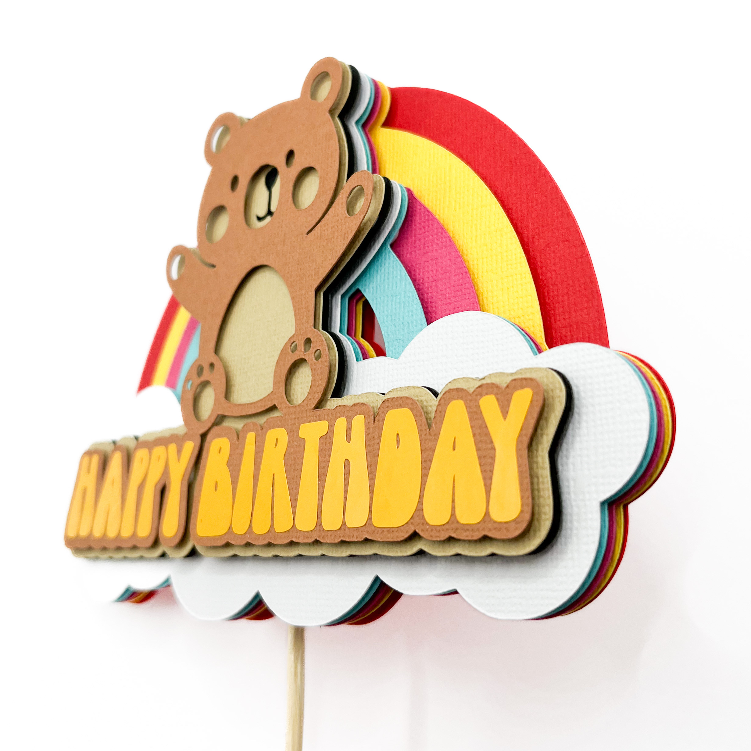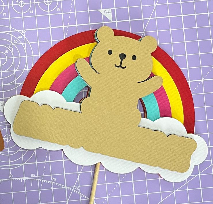 Create a fun and festive birthday cake topper featuring a cute bear, rainbow, and cloud using your Cricut, Silhouette, Scan n Cut, or other electronic cutting machine! This cheerful topper will add a personal touch and a pop of color to any birthday celebration.