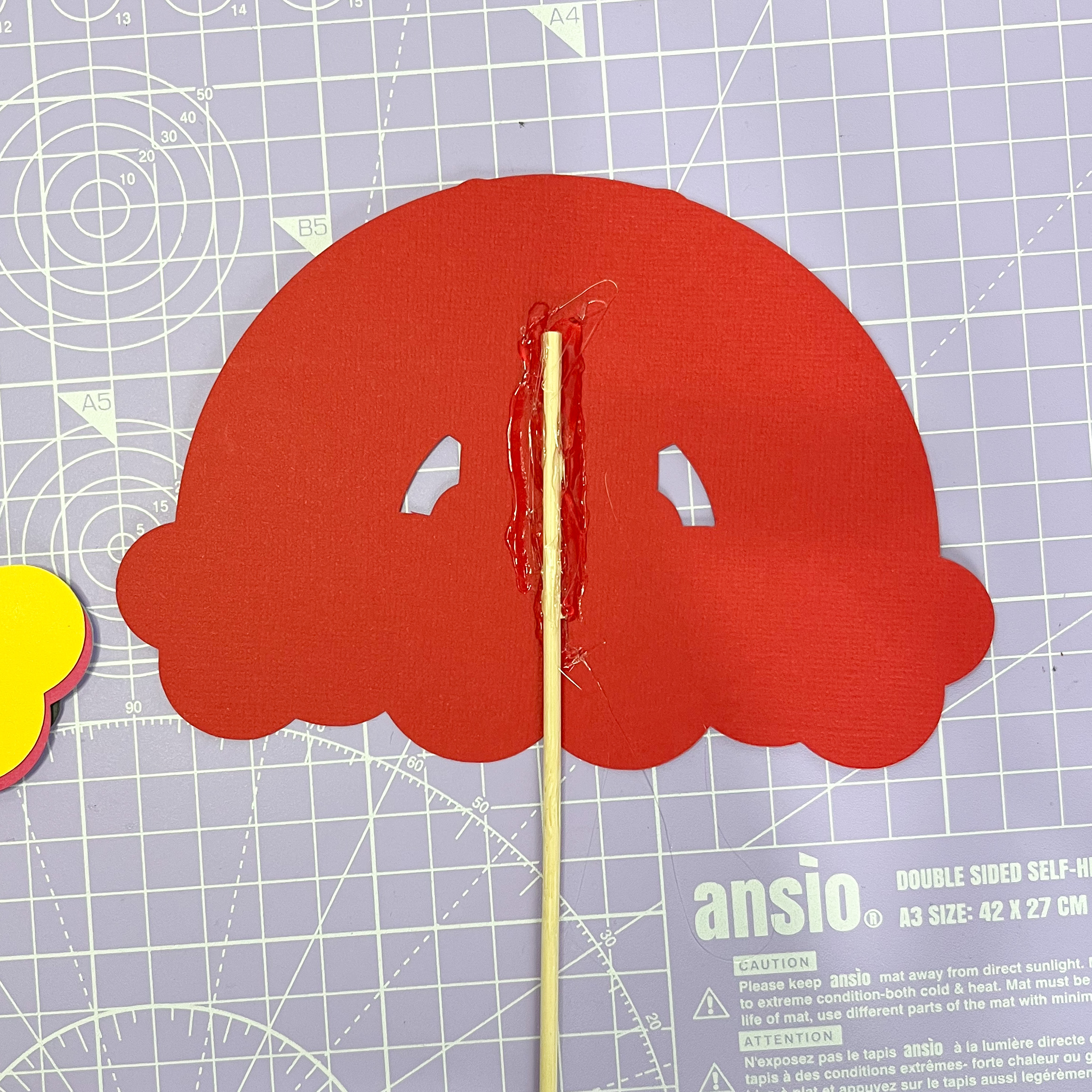 3. Using a glue gun, attach the skewer to the center of the red cardstock. Don’t worry about making it perfect—this part will be hidden in the final design, so it won’t be visible.