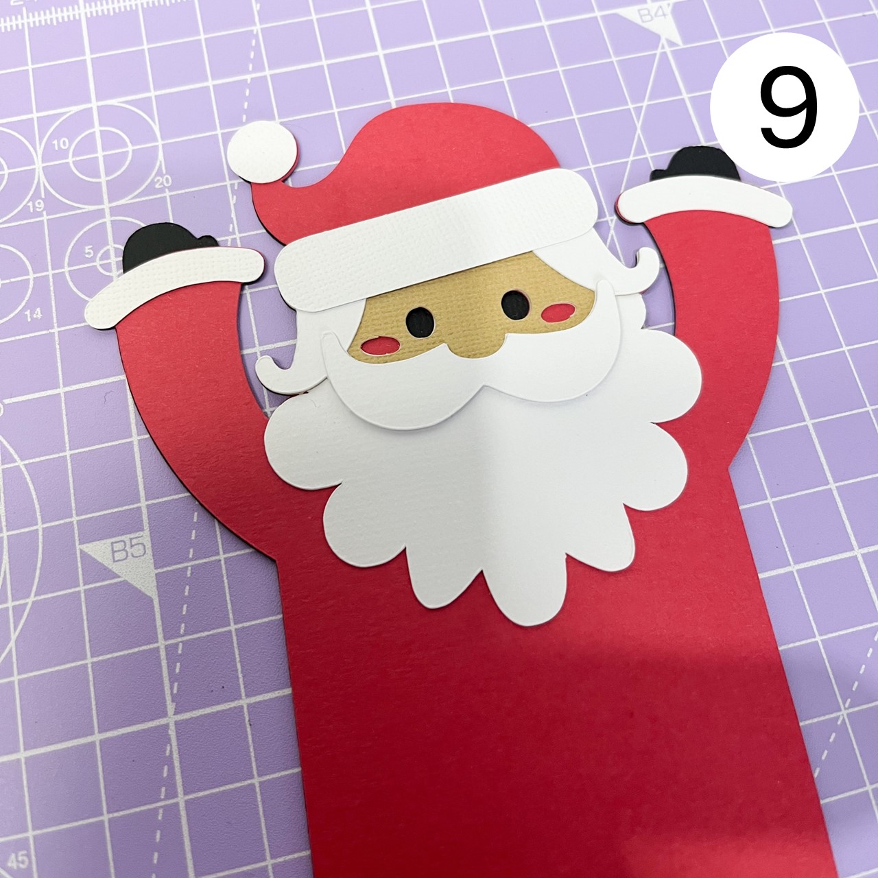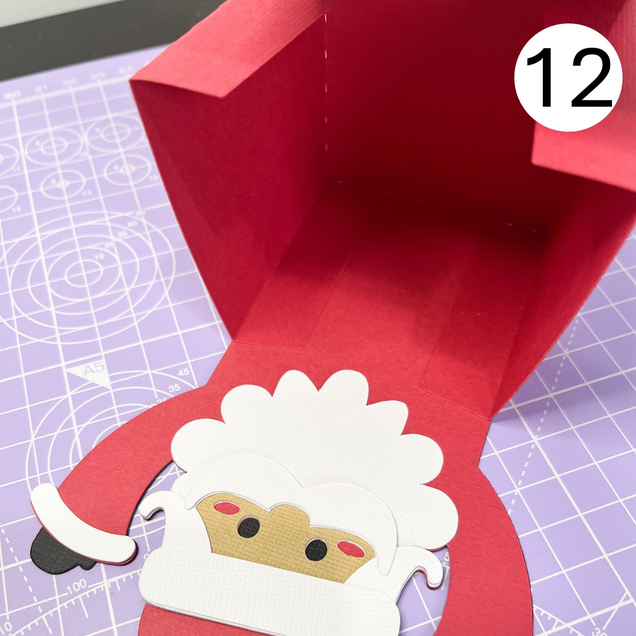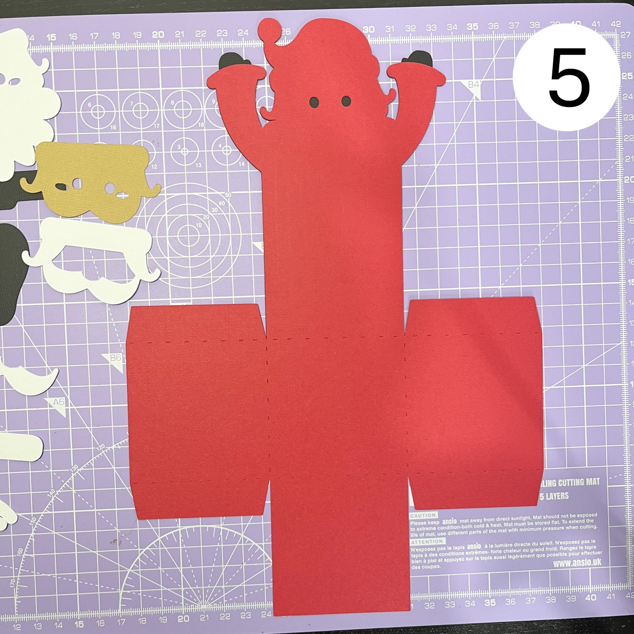 Fold the tabs upwards and stick them to Santa's body, aligning them as shown in the photo.