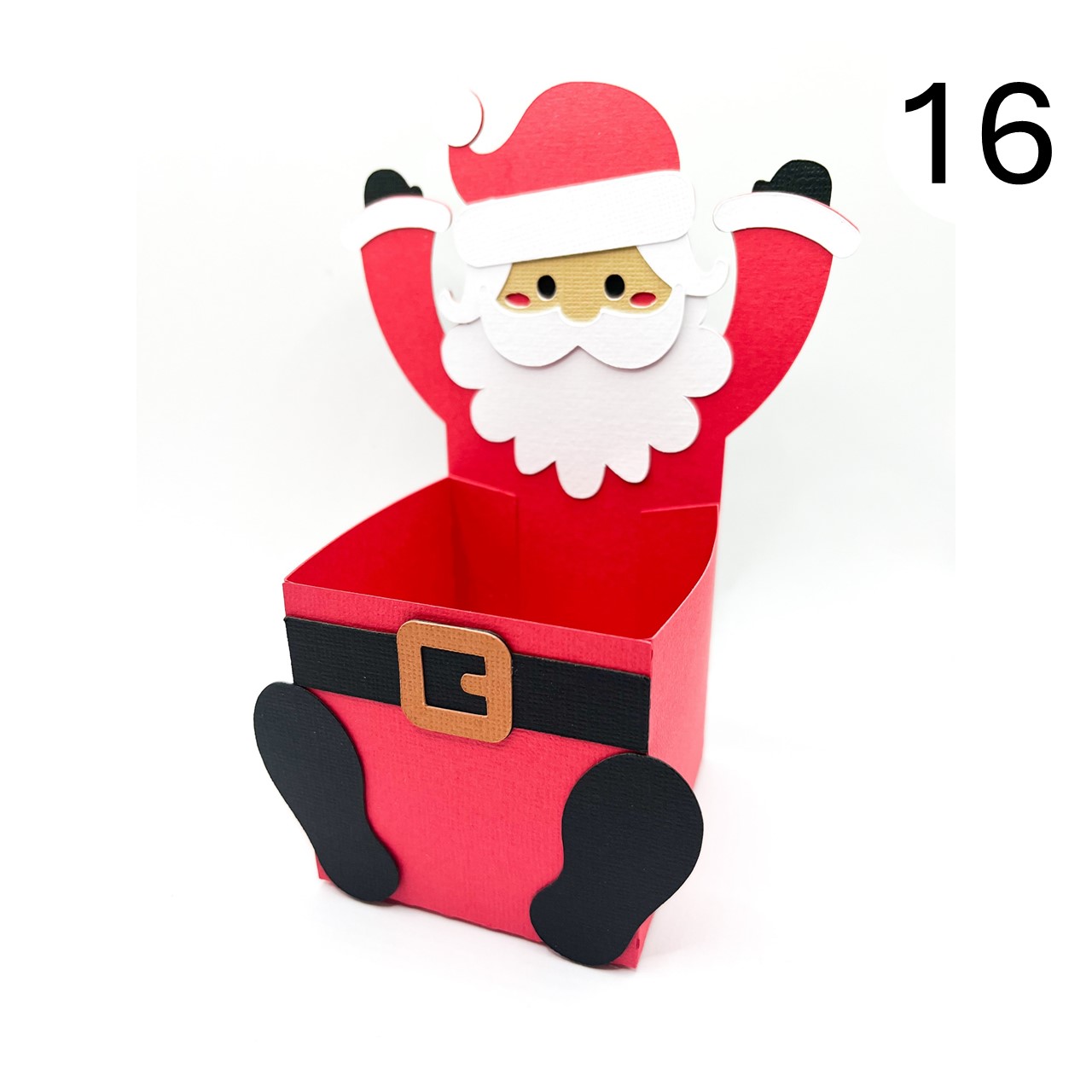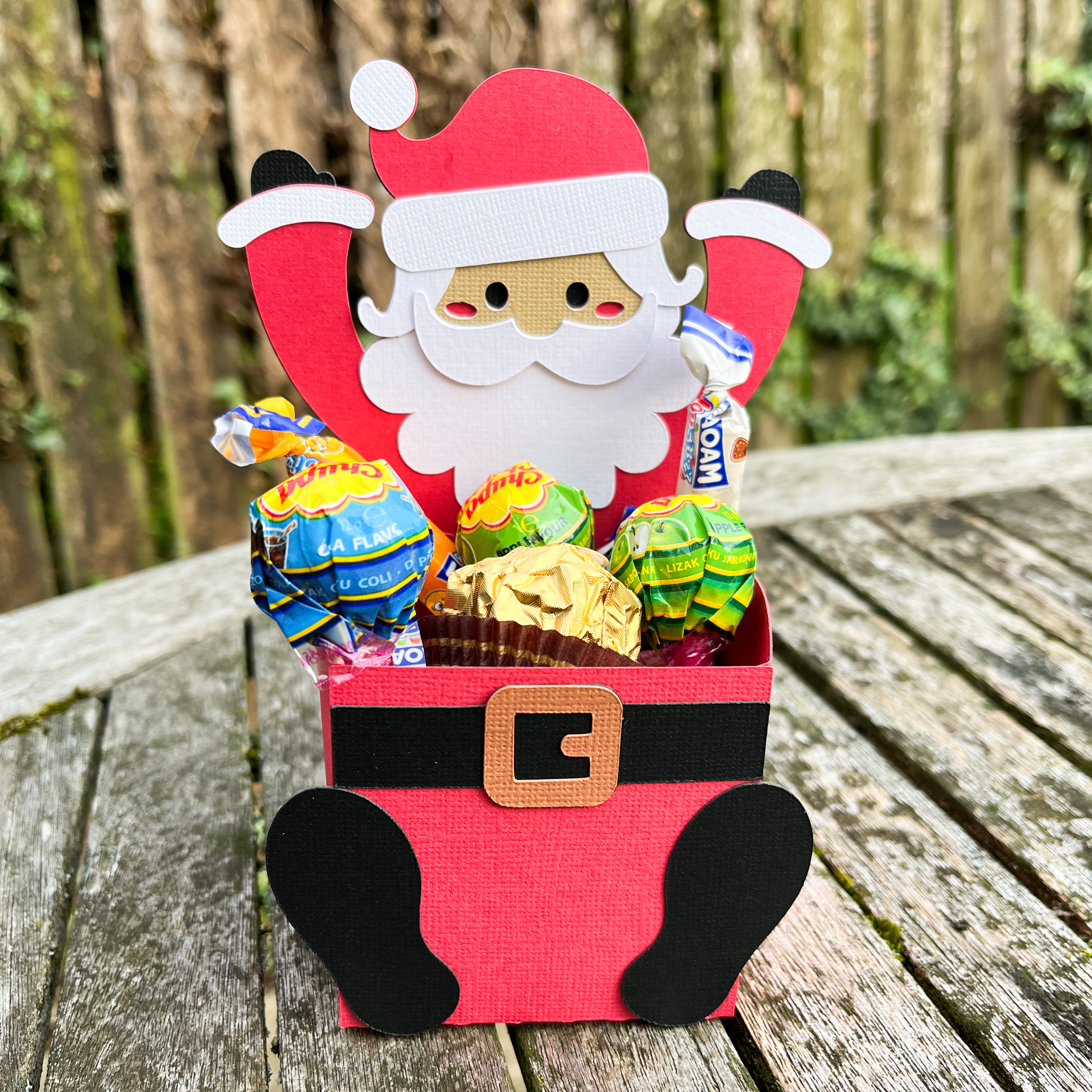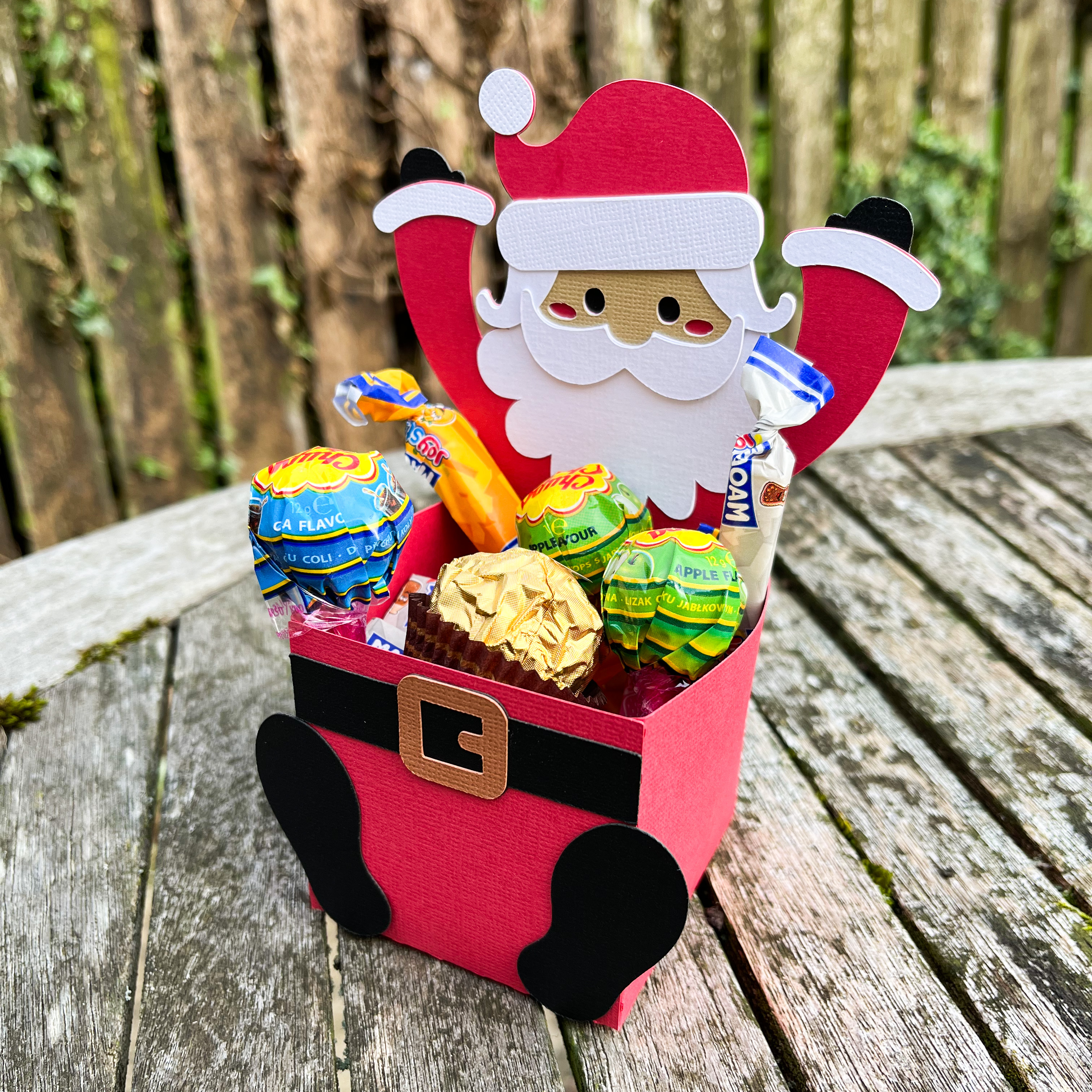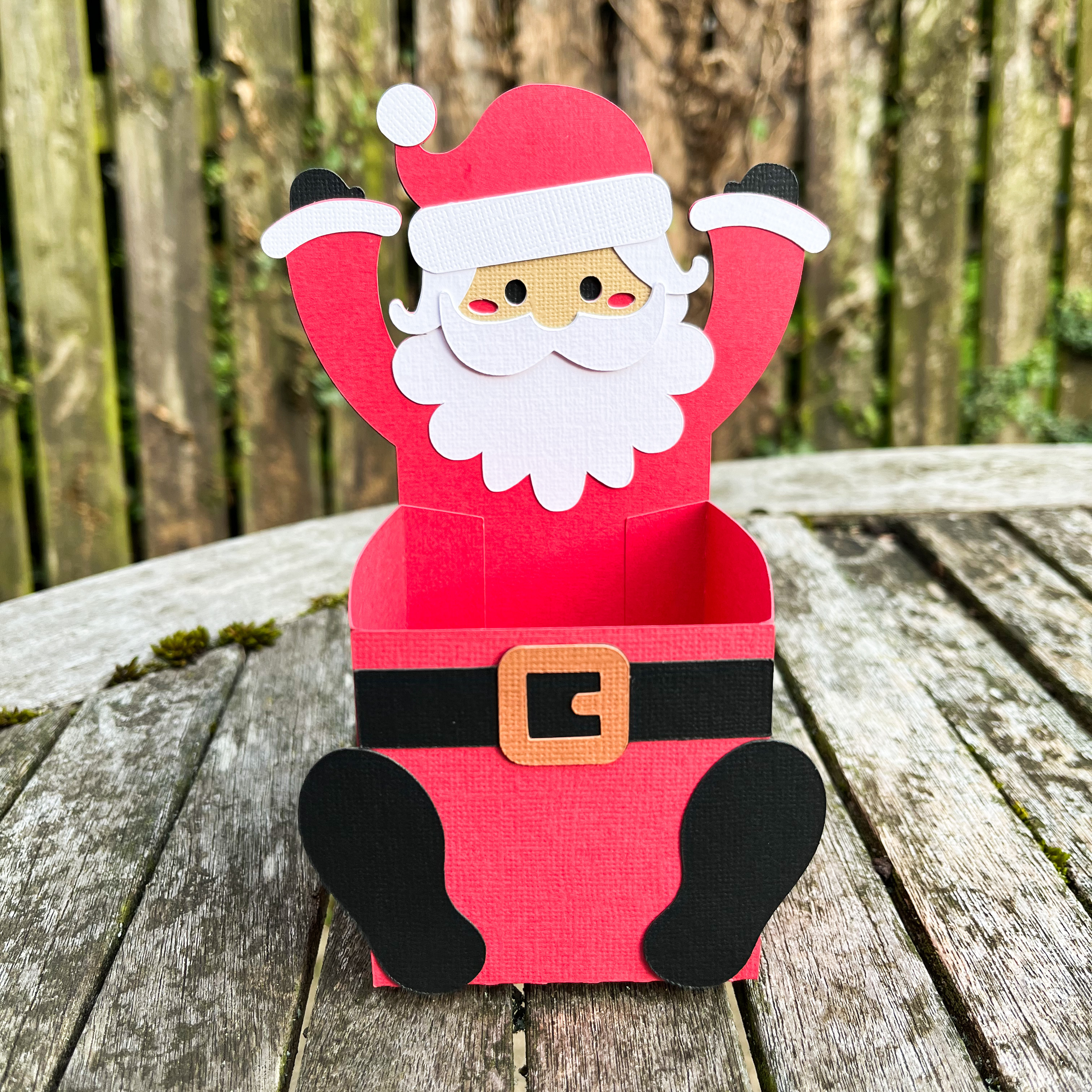 Now, glue the belt and feet onto the box, following the placement shown in the photo. Once everything is secured, your project is complete! Fill your Santa treat box with sweets or other festive goodies to enjoy.