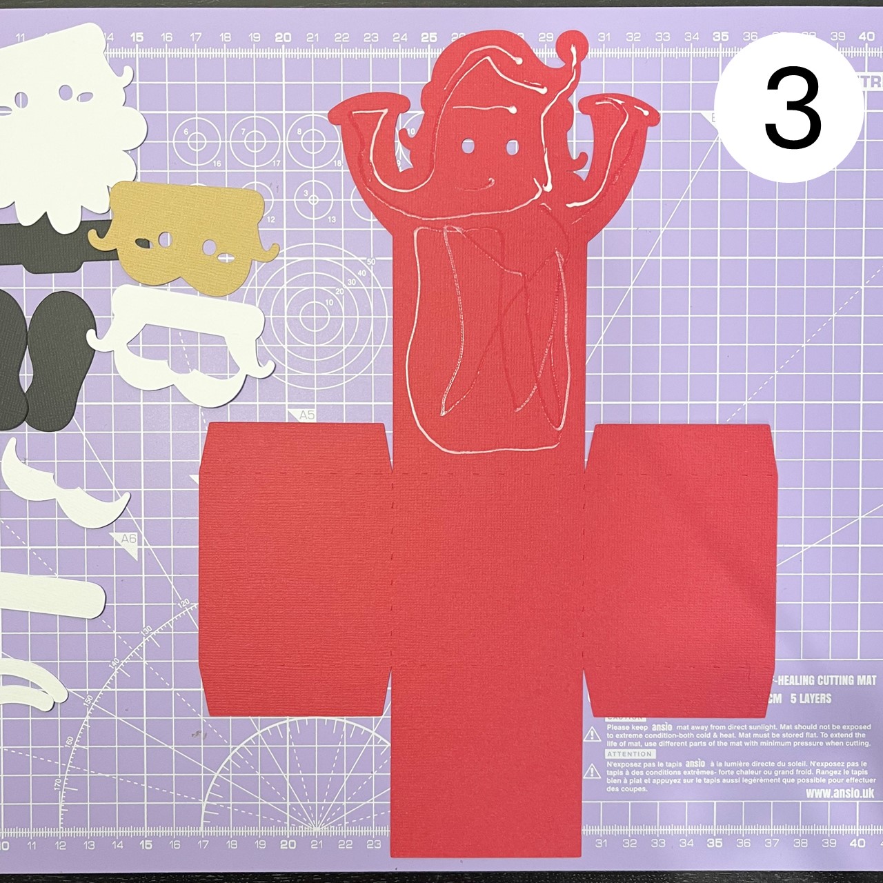 Glue the remaining white card stock pieces in place, including the hat trim, sleeve trims, and mustache, ensuring they align as shown in the photo.