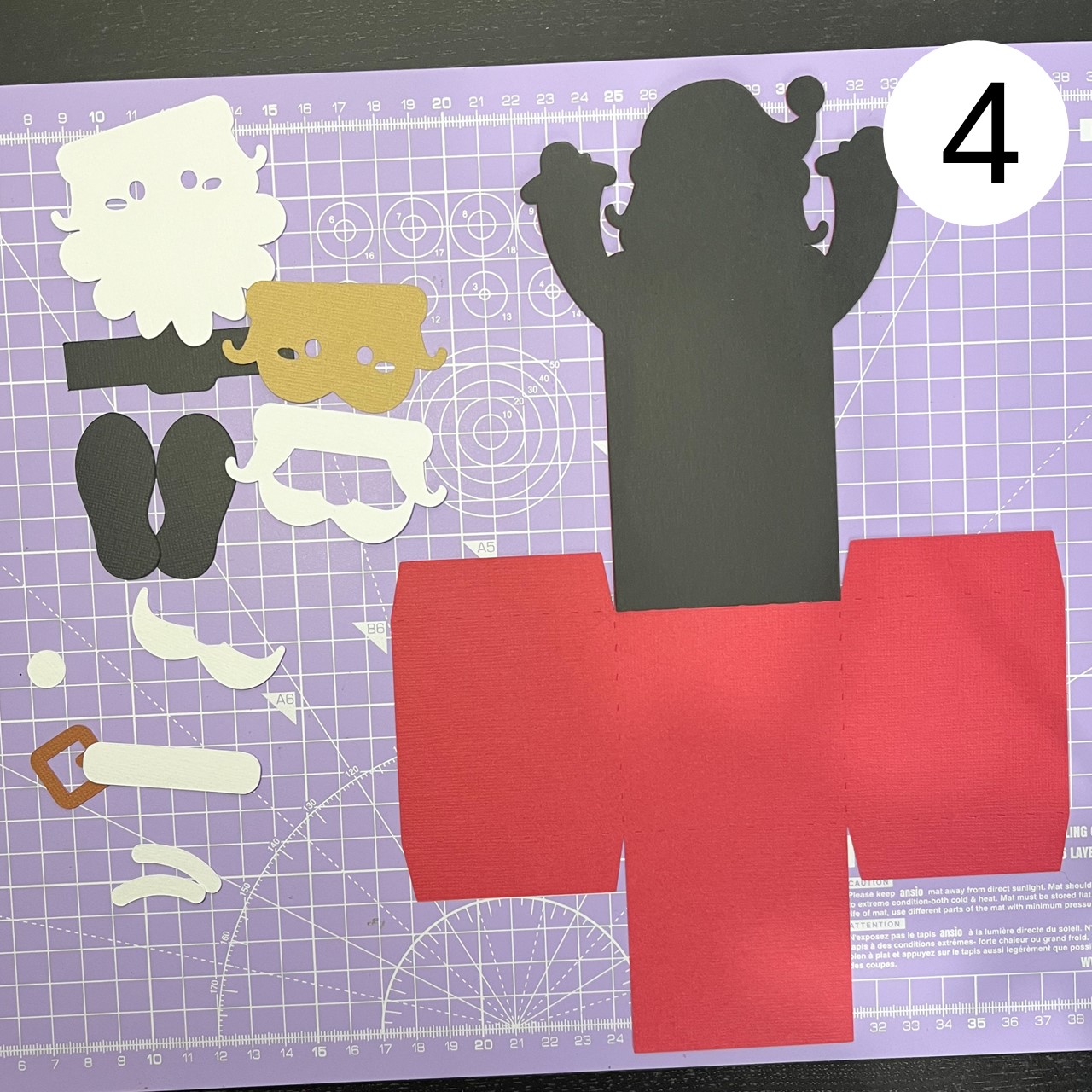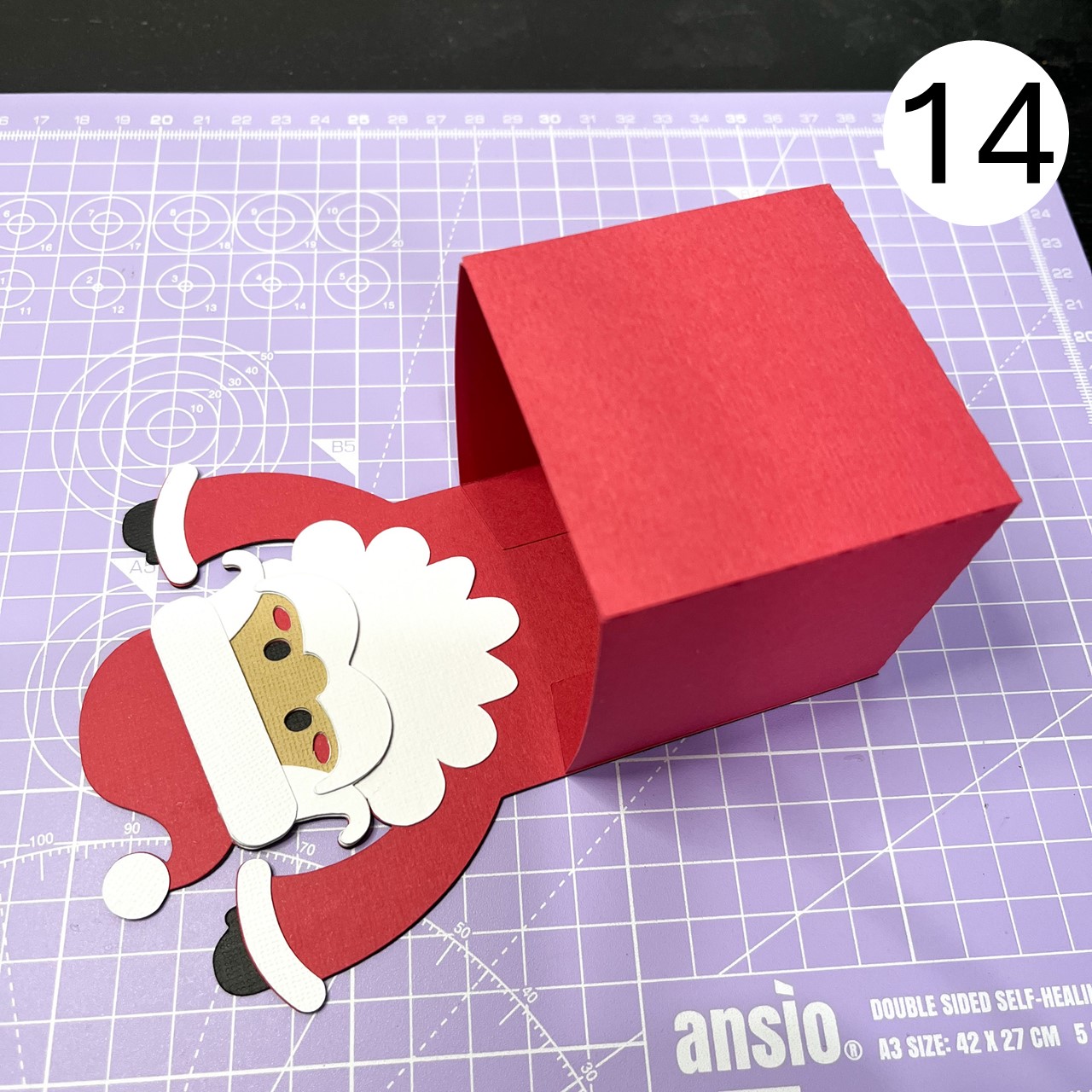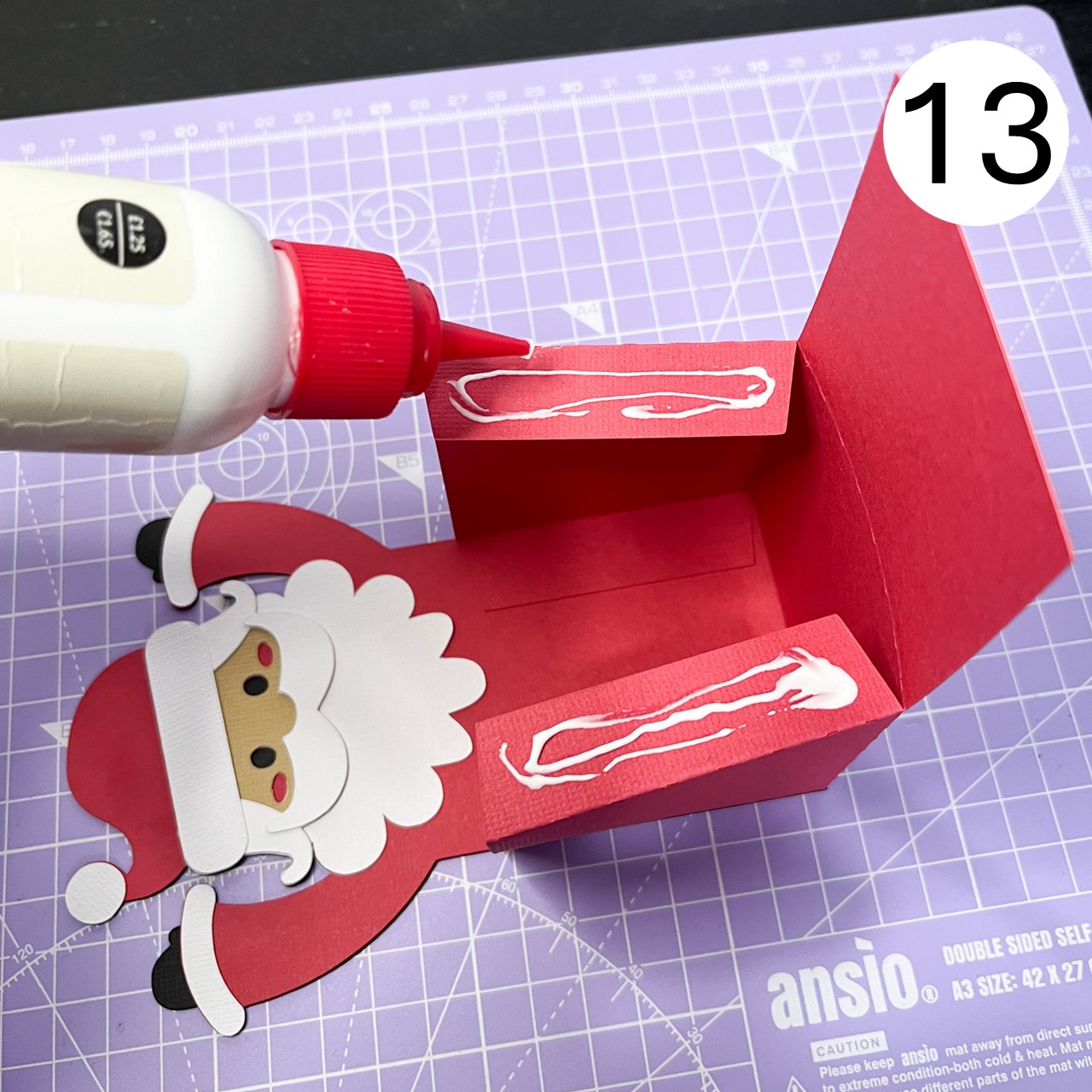Apply glue to the top section of Santa on the box base, following the placement shown in the photo.
